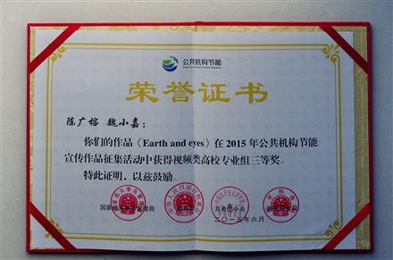 澳门彩票有限公司足球网上投注 代表学校参加2015年公共机构节能宣传作品征集活动,获评“优秀组织奖”,研究生陈广榕、魏小嘉的作品《Earth and Eyes》获得视频类高校组三等奖。本届大赛由由国家机关事务管理局、教育部、团中央、国家粮食局联合举办,涉及节水、节电、节粮以及节能环保等主题。