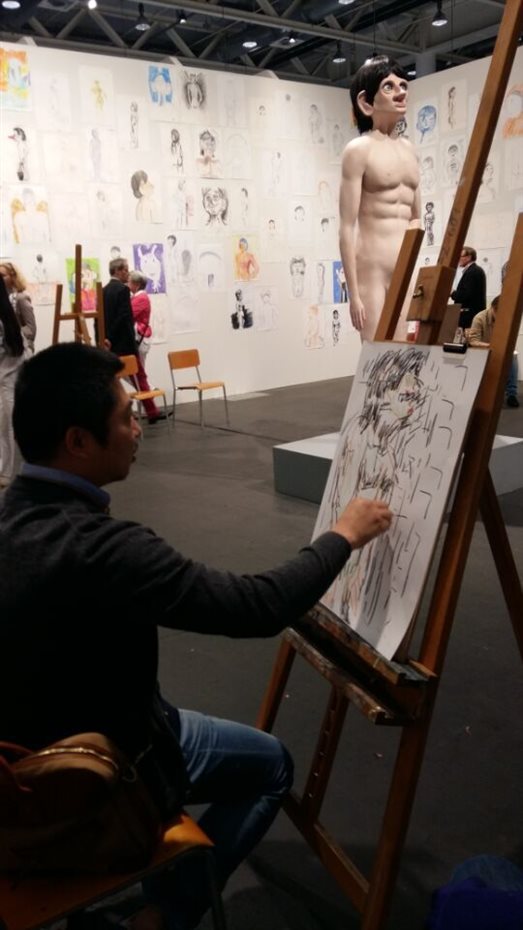 该展区还有很多作品注重互动性,召唤参观者参与。如英国艺术家david shrigley的作品《life model》,在展区中间安放一个比例夸张的人体模特,四周摆满了画架,邀请参观者写生。参观者的作品被贴在四面墙上,成为作品的一部分。当代艺术系教师也饶有兴趣的加入其中,共同赋予作品意义。