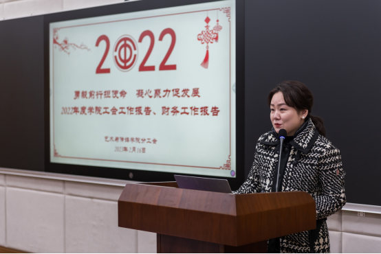 分工会主席周黎作2022年工会工作报告、财务工作报告。周黎围绕学院工会组织建设、思想建设、文化建设、关心教职工生活和维护教职工权益等等方面对分工会工作进行了全面阐述。