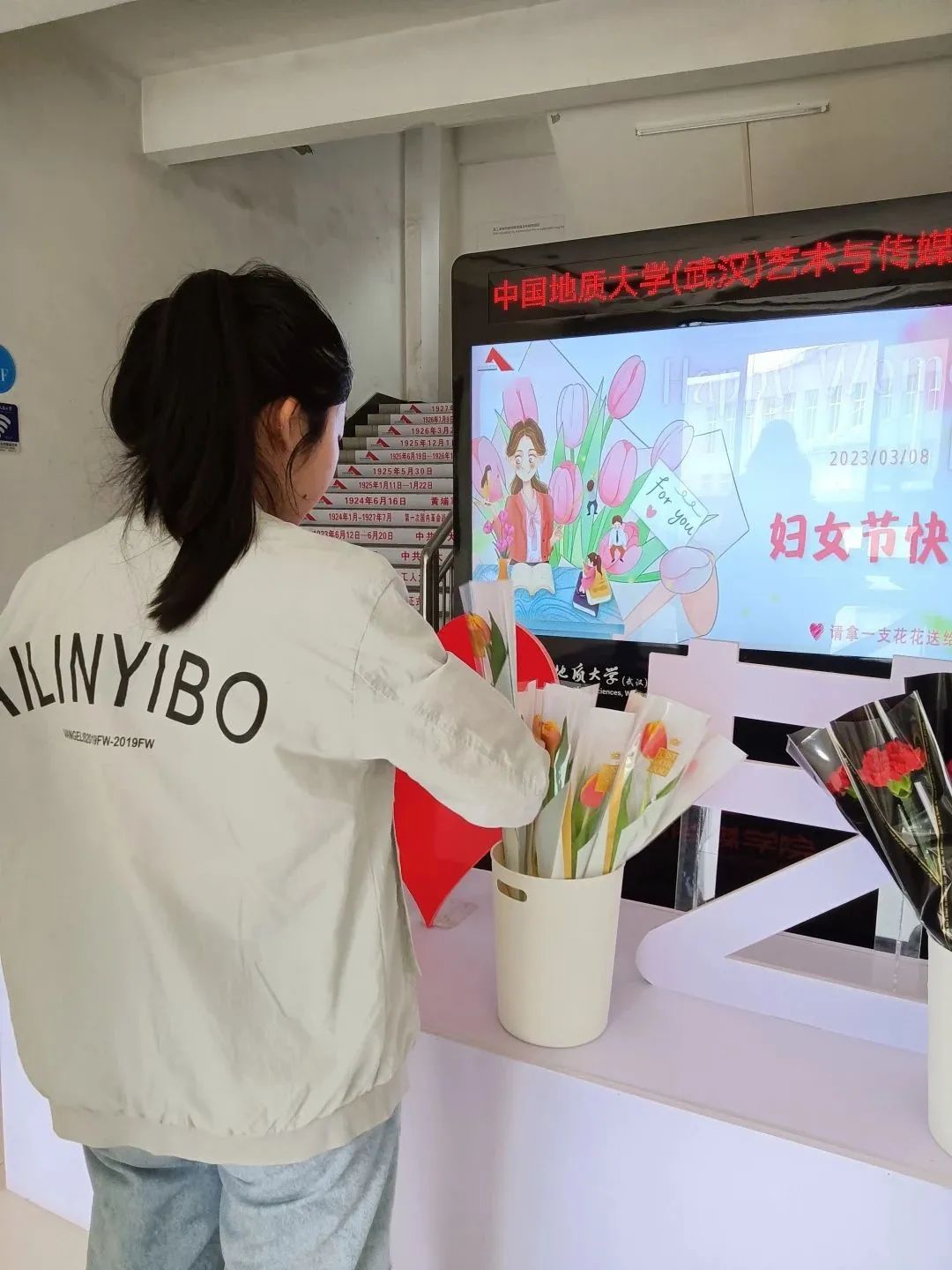 据悉,本次活动在艺媒楼大厅举行,吸引了众多女生前来参加。现场展示了各种鲜花,包括玫瑰、郁金香、康乃馨等等,每个女生都可以选择一朵自己喜欢的花免费领取。
