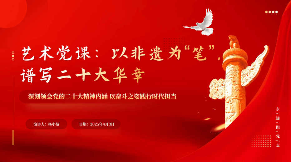 在宣讲结尾,该团队号召:“作为艺术专业的学生,我们要坚定不移地深入贯彻落实党的二十大精神以及习近平总书记的重要指示精神,进一步增强做好非遗保护工作的责任感与使命感。我们期望借助本次党课宣讲,引领各支部党员在感受我国非遗魅力中深刻学习党的二十大精神,并且,促使大家明确认识到艺术专业的学生如何依托专业优势,大力宣传党的二十大精神,创作出更多能够有效增强人民文化自信的优秀作品,切实担当起时代青年的重大责任。