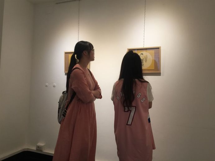 参观完黄老师的画作后,小组开始布置:取画框,裁画纸,摆放画作以及装置。不一会儿,十多个同学来来往往的匆忙身影,以及大家忙里偷闲的笑谈声,充满画廊的每一个角落。数小时后,高雅的画廊内已满是地大学子的作品,小组成员们的心中满满的成就感。