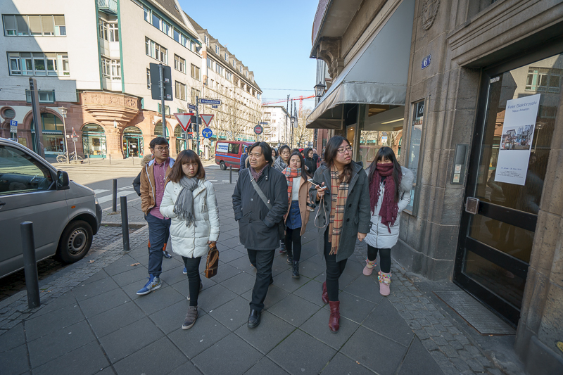 上午10点25分,访学团一行进入老城区,经国家现代美术馆,抵达法兰克福凯撒大教堂。法兰克福凯撒大教堂是一座典型的哥特式建筑,至今已有600多年的历史。教堂虽经过多次战争的洗礼,却依然屹立于此。站在教堂前的街道上,马林老师向访学团详细介绍了法兰克福凯撒大教堂的历史,并表示:“在二战时期,法兰克福凯撒大教堂的顶部曾被轰炸,虽然教堂的钟楼幸得留存,但教堂大部分区域都被严重损毁,所以直至如今仍在修复之中。”随后,访学团进入到教堂内部进行参观。