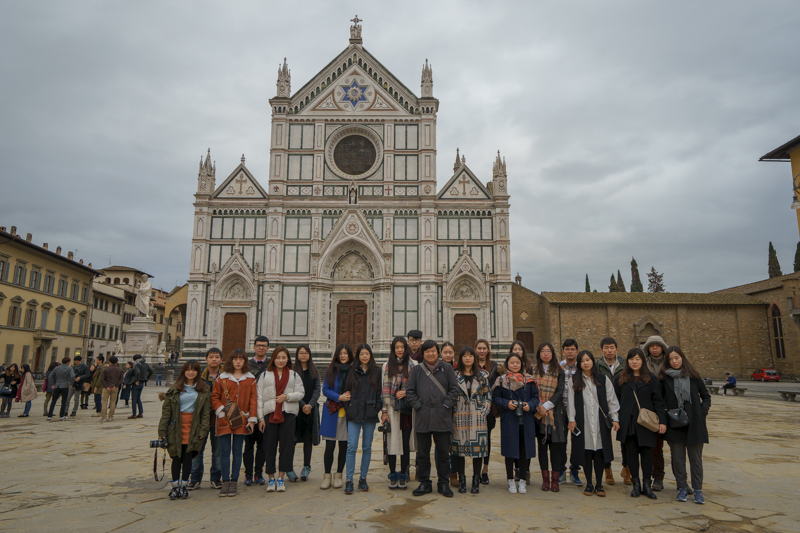 站在教堂前的广场上,马林老师向访学团详细介绍了圣十字架教堂的历史和文化,他认为,圣十字架教堂属于哥特式建筑,是由阿莫尔福·迪坎比奥于1294年开始设计和建造的。该教堂内还存有一些重量级名人的纪念碑和陵墓,但丁、米开朗基罗、伽利略等名人陵墓均在其中。