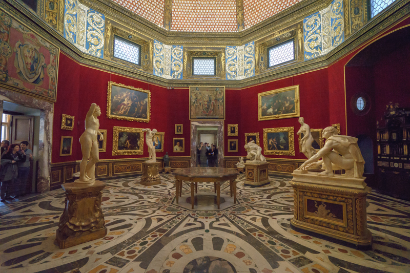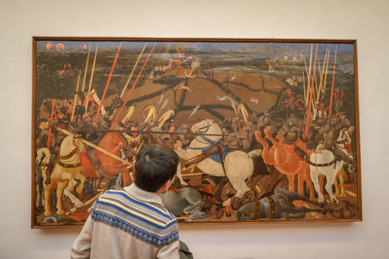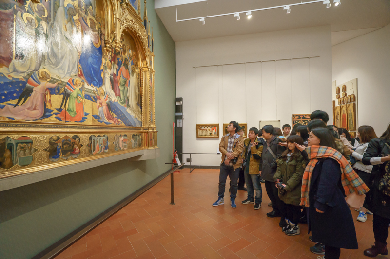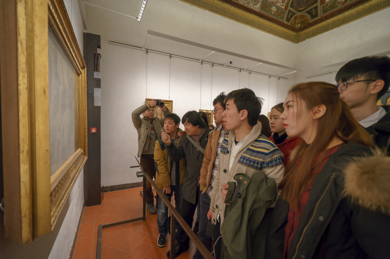 乌菲齐博物馆位于在意大利佛罗伦萨市乌菲齐宫内,以收藏欧洲文艺复兴时期和其他各画派代表人物如达·芬奇、米开朗基罗、鲁本斯、拉斐尔等人的作品而蜚声海外。马林老师认为,要细看馆内每一件作品,则所需时间太长,因而需要选择馆内最为精华的部分来观赏。说罢,便带领访学团一行进入博物馆内部,并有计划的欣赏馆内作品。