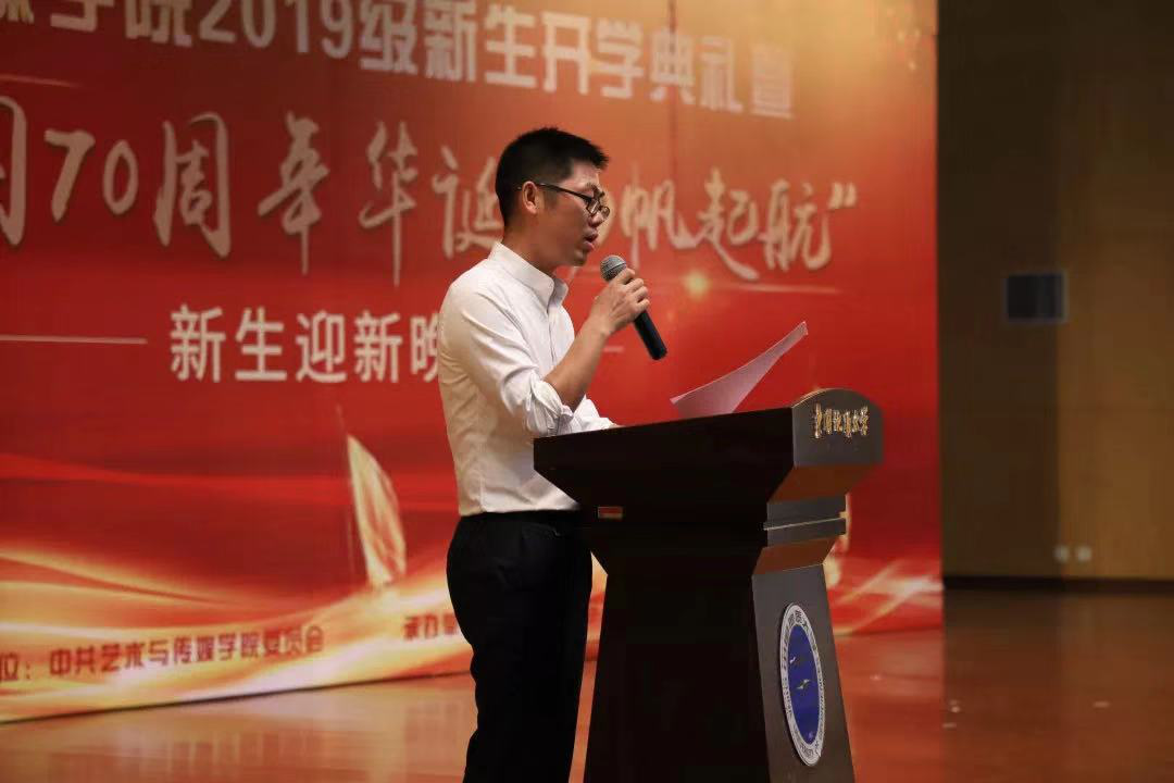 音乐学,设计学,新闻传播学近几年取得的成就。桂院长谈到,每年开学典礼上的讲话都是他十分重要的时刻,他和全体老师一样,希望艺媒学子在未来都能成为伟大的音乐家、设计师、新闻传播者和科普传播专家。讲话几度被场下热烈的掌声打断。最后,桂院长引用了中国美术学院校长许江的一句话:“我们对学生既不是管,也不是不管,而是两个字——守望”,期待大家能够不断成长,把自己的青春融合在每个学习的日常。